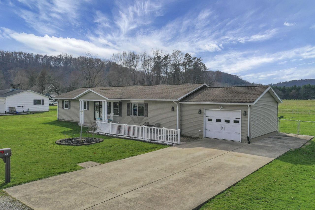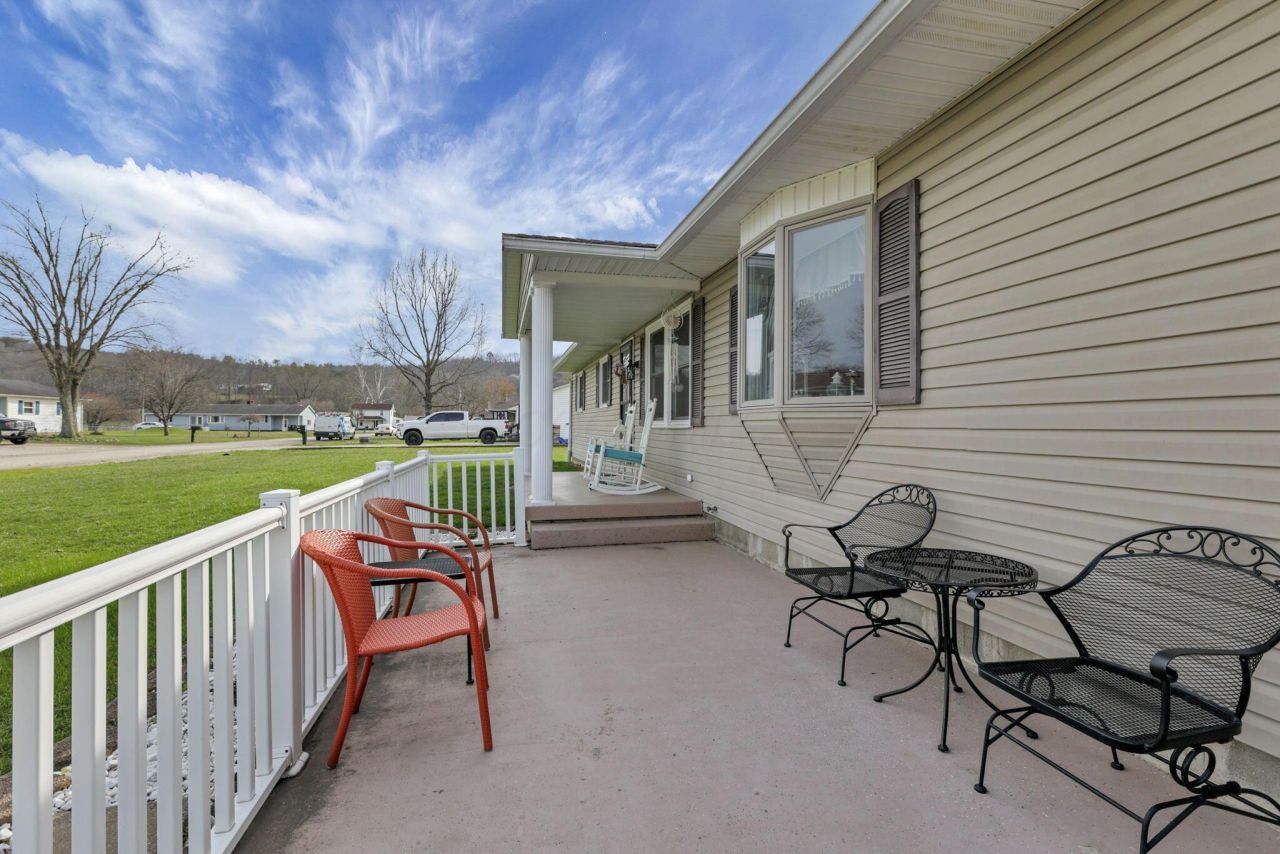 For those seeking easy one-story living, this beautifully updated 1800 sq ft ranch is tucked away on a secluded cul-de-sac on nearly ½ acre. The fenced yard overlooks a pasture, rolling hills, creating a quiet and scenic setting. Welcoming landscaping and a covered front porch lead inside to an open concept layout with neutral paint and solid oak hardwood floors throughout the main level. The updated kitchen features granite countertops, an island with seating, newer stainless steel appliances, and luxury vinyl tile flooring that continues through the kitchen, bath, and laundry. A stunning 4-season Sunroom with vaulted pine ceiling connects the back patio to the spacious living area, perfect for relaxing or entertaining. Large Living Room w/propane Fireplace & bay window. Enjoy both front and back patios, plus two storage sheds (8x12 and 12x20 with loft and electric). Appliances, washer, dryer, and TVs convey. New Furnace w/Heat Pump, A/C (2019) Newer Windows, New Full House Generator. Concrete Driveway with tons of parking.