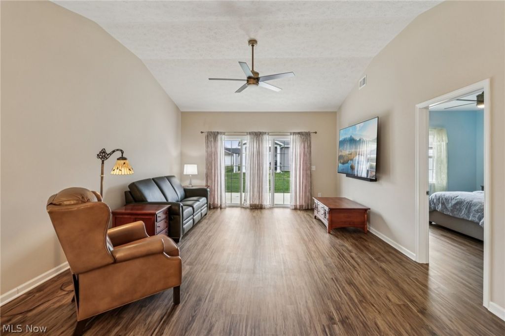 Beautiful 2-year-old, maintenance-free, one-floor home offering modern design, quality finishes, and effortless living. This open-concept layout features 2 spacious bedrooms, 2 full baths a bright living-dining area with a 3-panel sliding glass door that fills the space with natural light and provides easy access to the concrete patio. The kitchen showcases quartz countertops, subway tile backsplash, recessed lighting, stainless steel appliances, a pantry closet, and plenty of cabinet space. All light fixtures and ceiling fans have been upgraded throughout the home, with an investment of over $5,000. The primary bedroom includes a spacious walk-in closet and a private en-suite bathroom. Both bathrooms have quartz vanity countertops. A dedicated laundry room adds convenience, and the home has no basement, making it ideal for low-maintenance living. 2-car garage comes equipped with a garage door opener and water access, offering added functionality. Located close to shopping, dining, and everyday conveniences, this home offers quick possession and easy living in a desirable community.